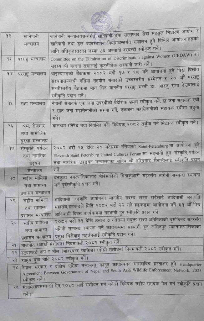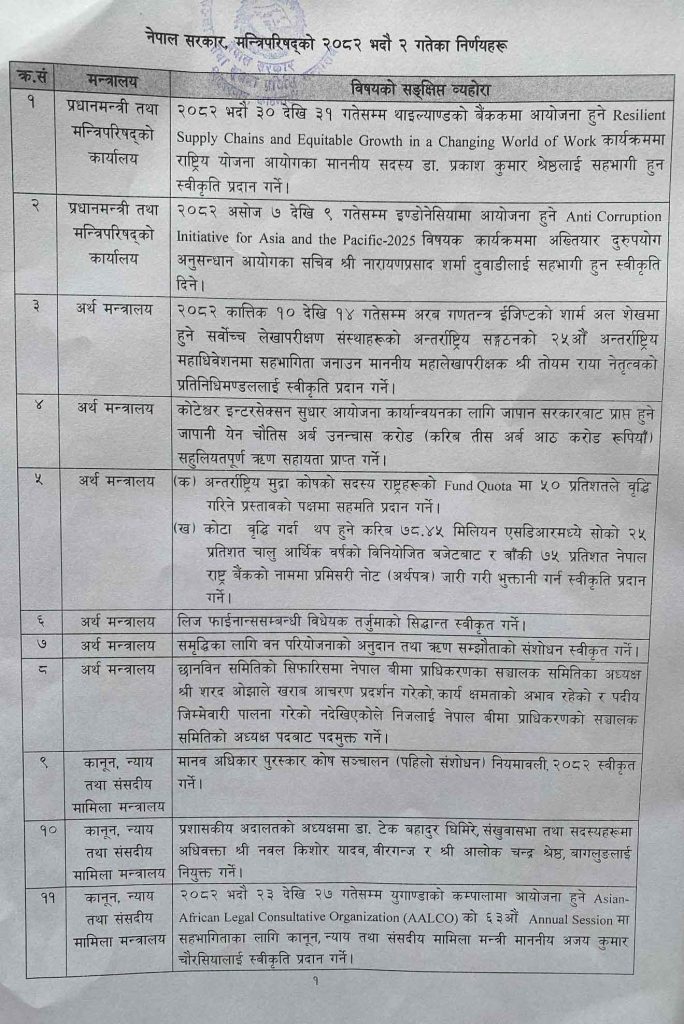 Additionally, the Cabinet decided to dismiss Sharad Ojha, Chairperson of the Board of Directors of the Nepal Insurance Authority, citing misconduct, lack of efficiency, and failure to fulfill official responsibilities.