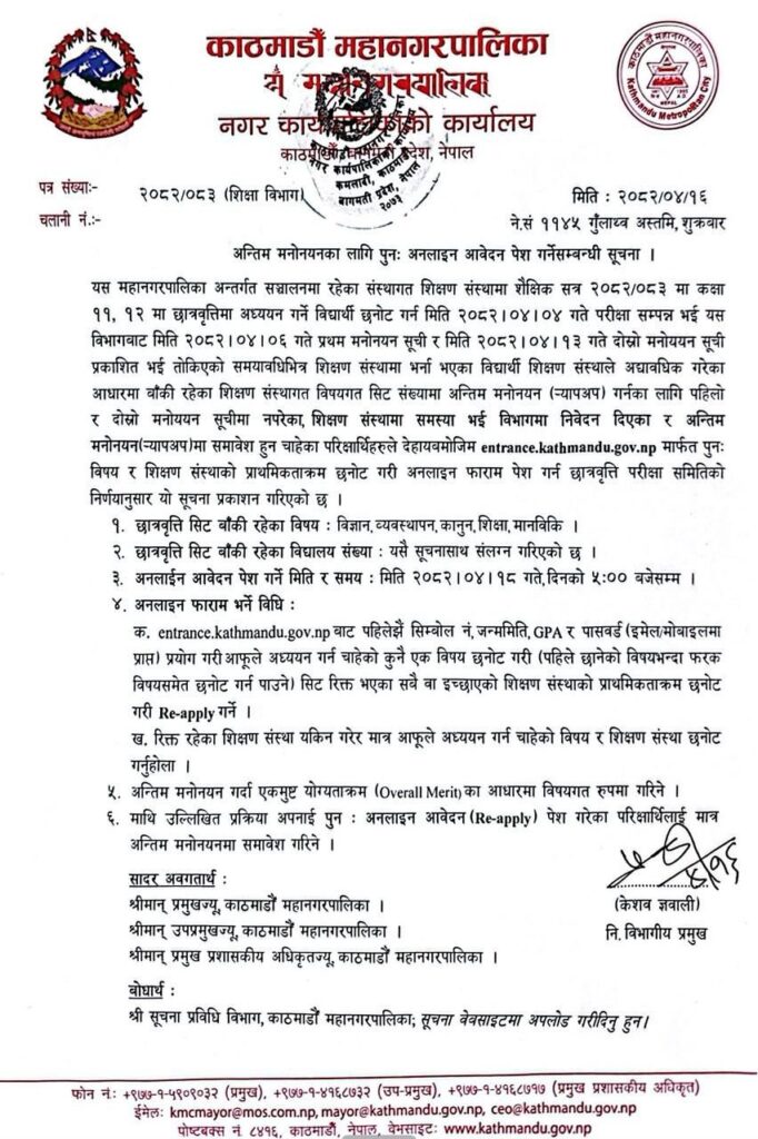 The Kathmandu Metropolitan City (KMC) has reopened online applications for scholarship admission to Grades 11 and 12 for the academic year 2082–83 (2025–2026) to fill the remaining vacant seats.