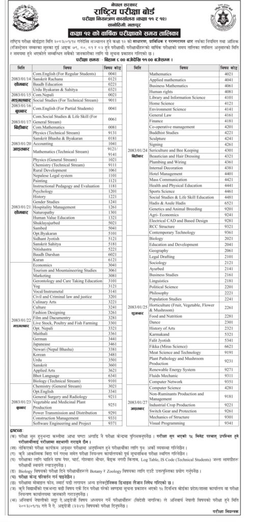 The board has stated that students who are absent in the exams ending on Baisakh 27 will not be given another chance to take the exam. If an unexpected public holiday falls within the exam schedule, exams will not be postponed without prior notice from the Office of the Controller of Examinations.