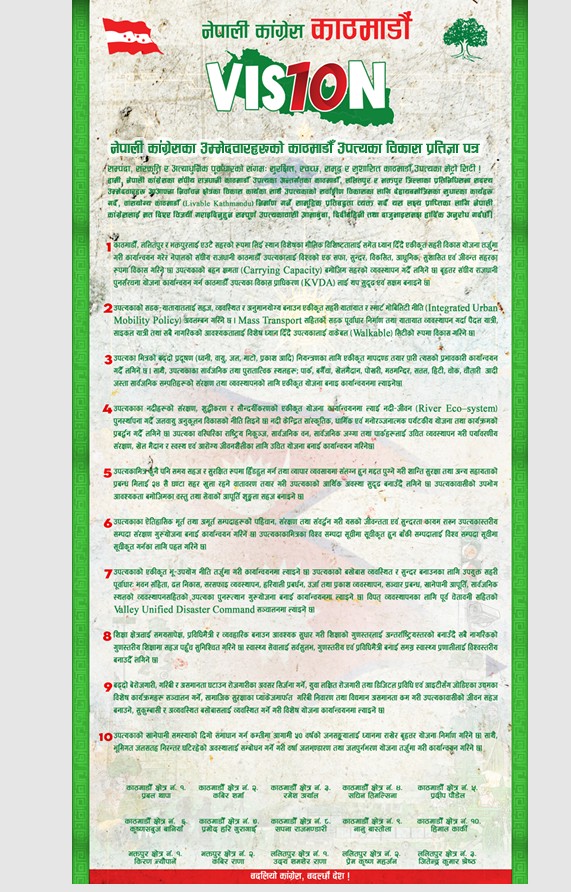 The Nepali Congress candidates for the House of Representatives in the federal capital, Kathmandu Valley, have made public the “Nepali Congress Kathmandu Valley Development Commitment Letter: Vision 10.”