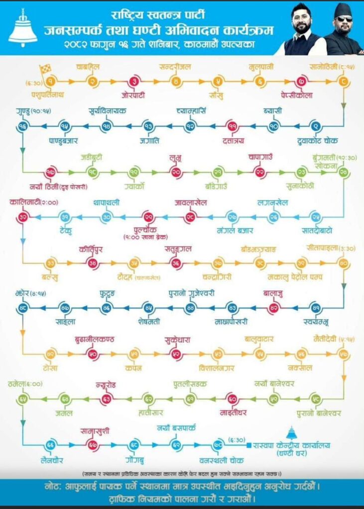 After a lunch break at 1 pm, the campaign will continue through Kalimati, Teku, Thapathali, Kirtipur, Balkhu, Satungal, Chandragiri, Sitapaila, Swayambhu, Balaju, Machhapokhari, Tokha, Budhanilkantha, Sukedhara, Bishalnagar, Baluwatar, Naxal, Maitidevi, Old Baneshwor, New Baneshwor, Maitighar, Putalisadak, Jamal, Lainchaur, Samakhusi, and Gongabu before concluding at the party’s ‘Ghanti Ghar’ in Banasthali.
