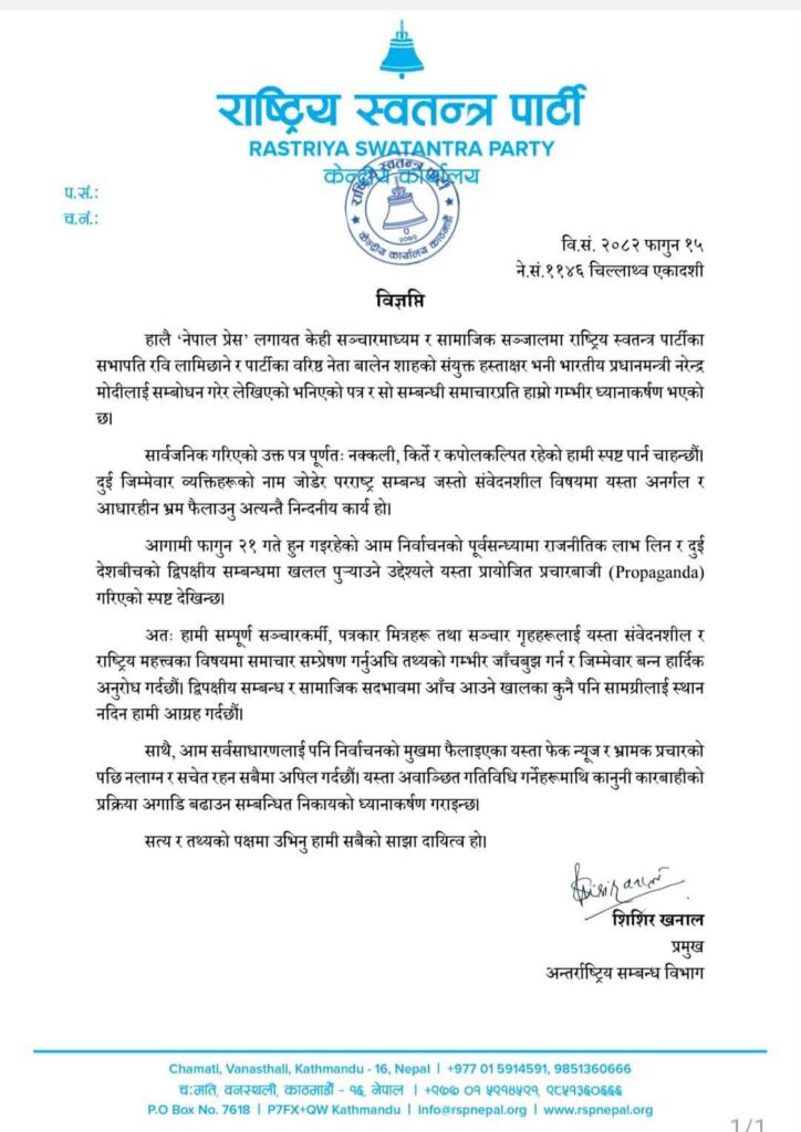 RSP clarified that the publicly circulated letter is entirely false and said that linking the names of responsible individuals to such a sensitive matter as bilateral relations is highly condemnable. The party claimed that the sponsored propaganda appears to have been spread with the intention of gaining political advantage ahead of the general election scheduled for Falgun 21 and of creating unnecessary suspicion in Nepal–India relations.